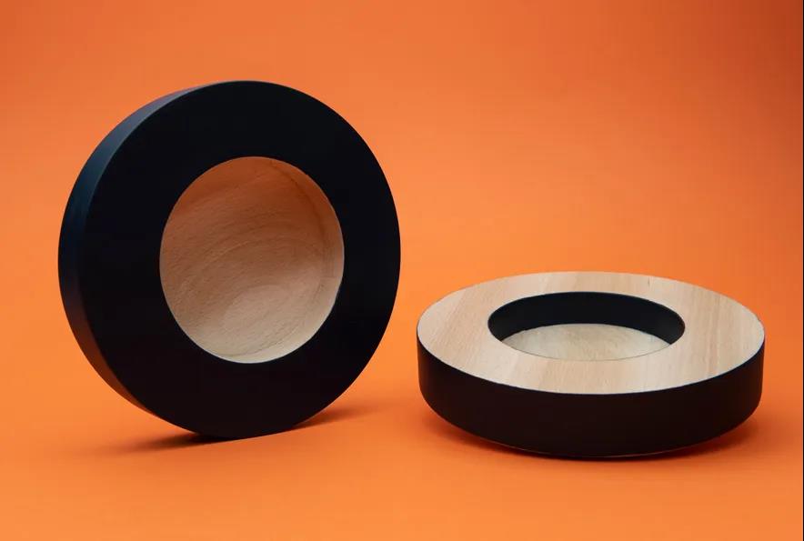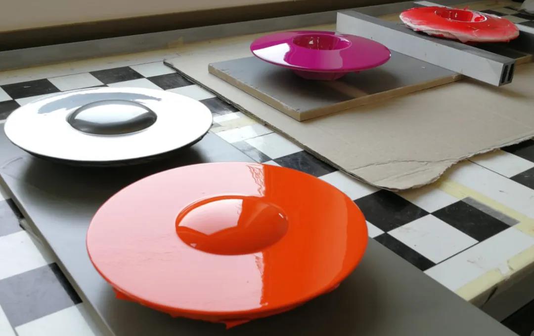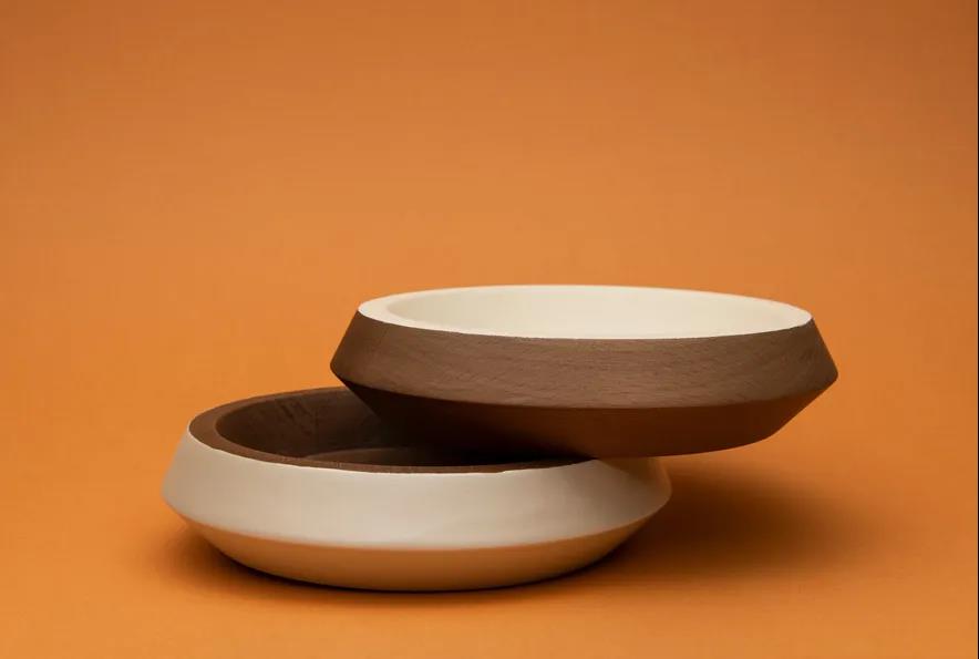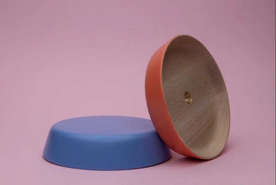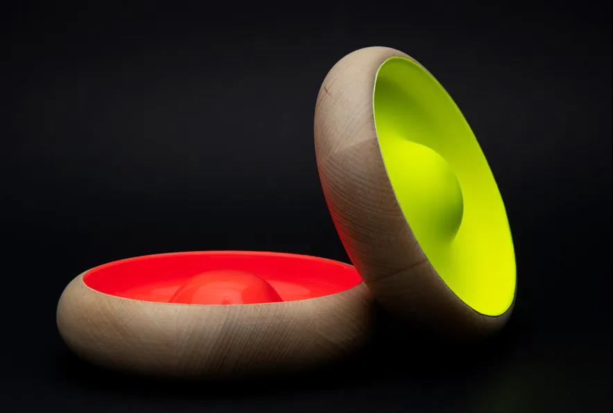 Giulia選擇了鮮艷的熒光色彩及不同的光澤度來(lái)型造出澎拜的視覺沖擊。中間突出的造型有如矗立于湖中的小島,內(nèi)部高啞光的鮮艷色彩映照外部簡(jiǎn)約自然的木材表達(dá),設(shè)計(jì)師企圖在這個(gè)細(xì)小的木盤上創(chuàng)造不同的沖擊和矛盾。