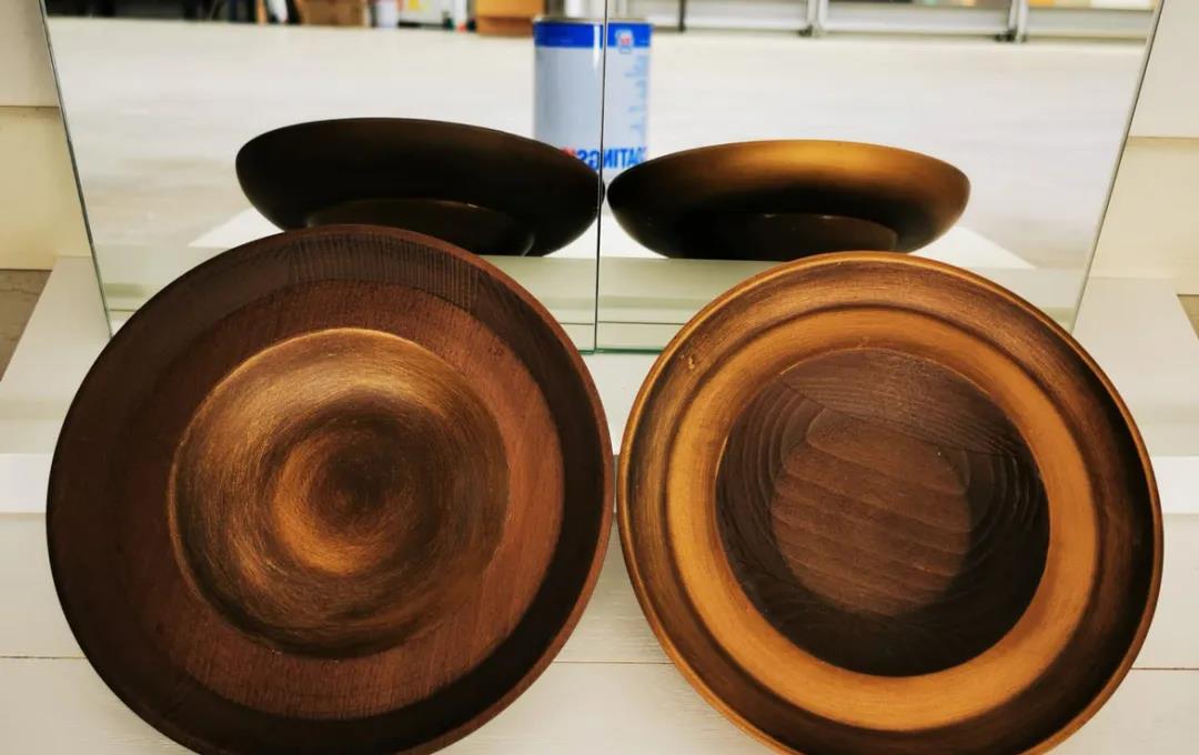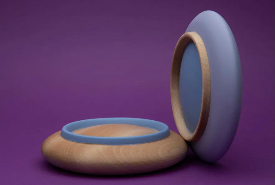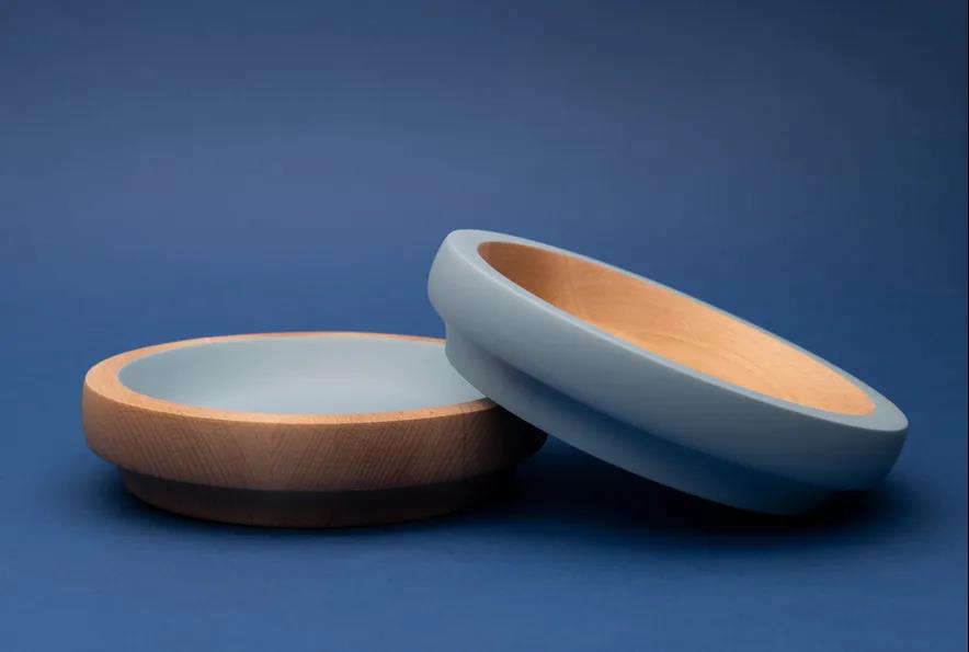 為了要表達(dá)人工合成材質(zhì)共生于自然環(huán)境當(dāng)中,Simona特意選擇了當(dāng)代流行的粉彩藍(lán)色,并在顏色上再涂上仿塑料材質(zhì)的透明涂層。在木盤上同時(shí)呈現(xiàn)合成與天然材質(zhì),反映我們目前身處的生活環(huán)境。