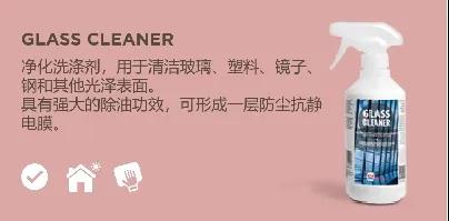 | Glass Cleaner | 適合用于清潔玻璃、金屬室內(nèi)高光涂層,除味除塵除菌除油,使用后的表面抗防靜電。 |
